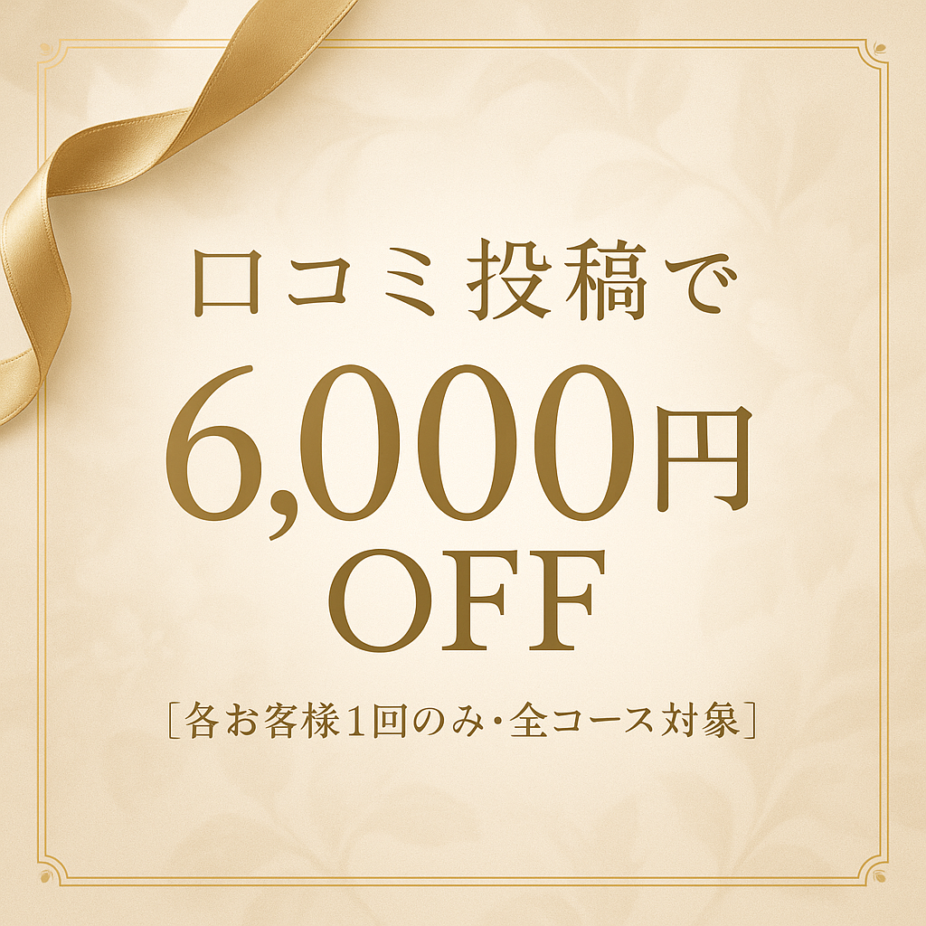 Google口コミ投稿キャンペーン – 各お客様1回限りの特別優待✨ 2025/11/06 いつもご利用いただきありがとうございます。 このたび当店では、皆さまの日頃のご愛顧に感謝を込めて、Googleマップの当店ページに口コミを投稿していただいたお客様に、全コース6,000円OFFでご案内いたします。 ✨ご利用条件✨ ・お一人様一回限りの特別優待となります。 ・施術後にGoogleマップへ口コミを投稿いただけるお客様が対象です。 ・全コースでご利用可能です。 ・他クーポン・イベントとの併用はできません。 ご投稿は施術後にスタッフよりご案内いたします。 皆さまの温かいお声を励みに、より一層ご満足いただける時間をお届けいたします。